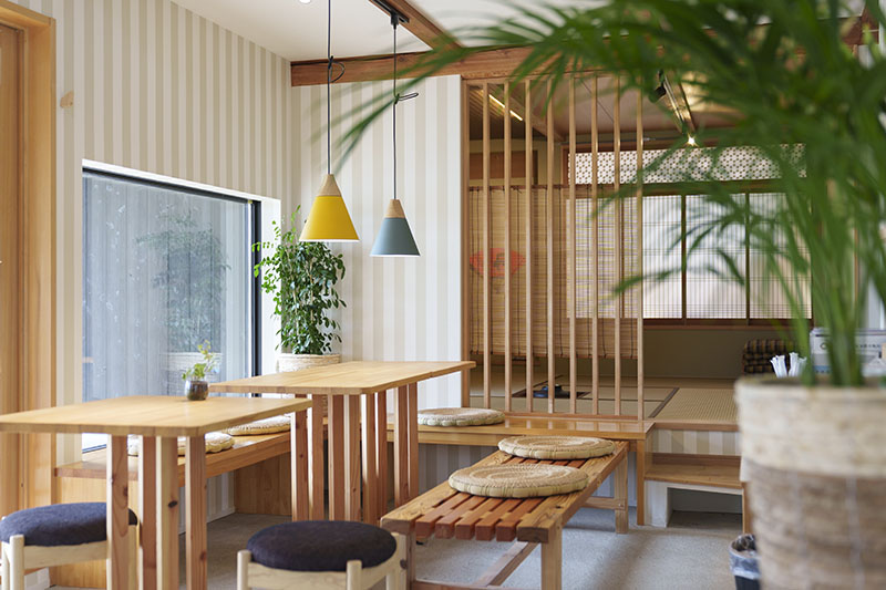 カフェを営むのは茶の湯やあんこなど和文化をこよなく愛するご夫婦。自家製あんこが評判で、そのあんこをおいしく楽しく食べてもらえるメニューを多彩に用意しました。地元のひとにもくつろいでもらえるように、店内は洋の雰囲気も取り入れています。